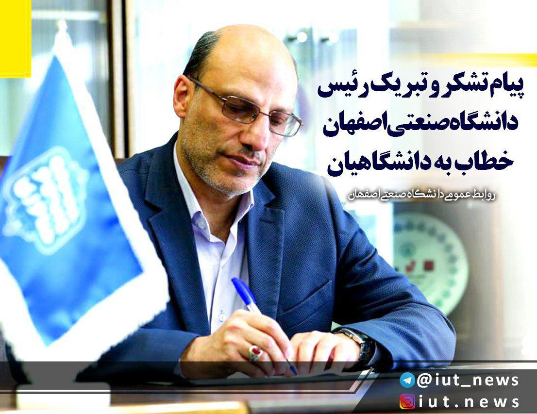 پيام تشكر و تبريك رئيس دانشگاه صنعتي اصفهان خطاب به دانشگاهيان عزيز