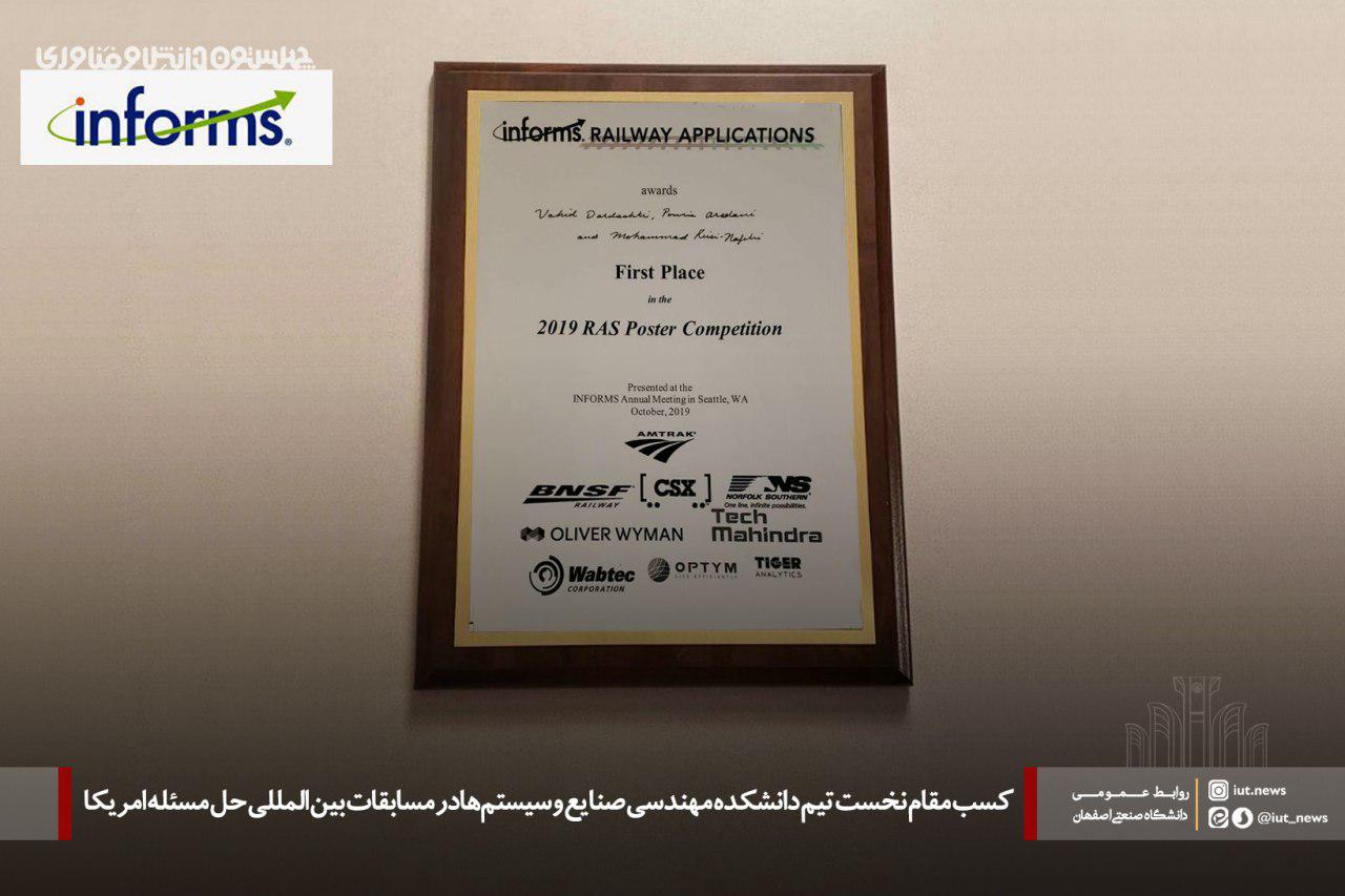 گفتنی است: مسابقات بین‌المللی حل مسئله در حوزه حمل و نقل ریلی (RAS 2019 INFORMS) از سال 2010 و به صورت سالیانه برگزار می‌ شود و این برای اولین بار است که یک تیم از دانشگاه‌های ایران موفق به کسب چنین مقامی در مسابقات با این سطح می‌شود.