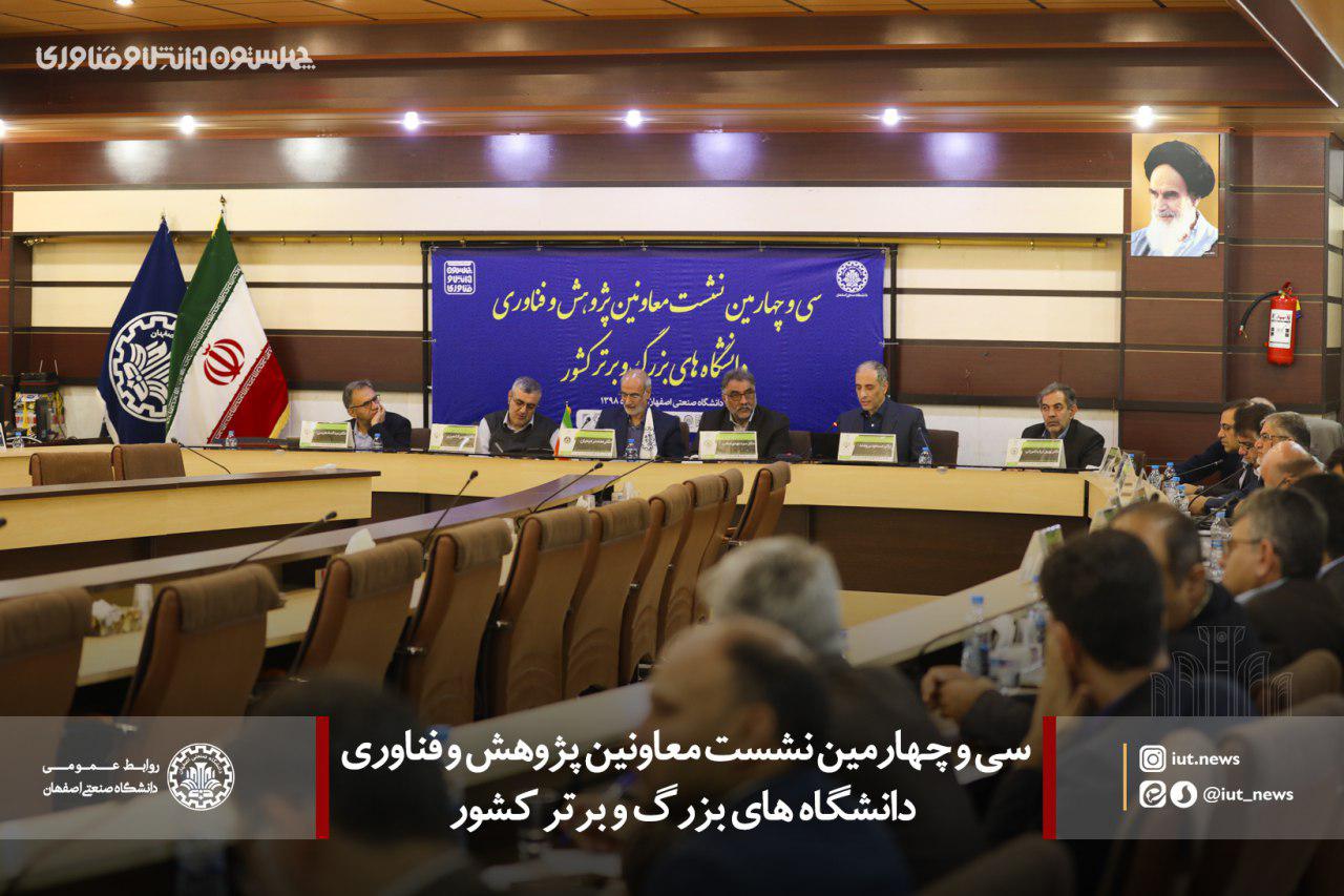 سی و چهارمين نشست معاونین پژوهش و فناوری دانشگاه هاي بزرگ و برتر کشور، صبح امروز با حضور معاون پژوهش و فناوری وزارت علوم، تحقیقات و فناوري و معاونین و مدیران پژوهشی این دانشگاه ها، به ميزباني دانشگاه صنعتی اصفهان برگزار شد.