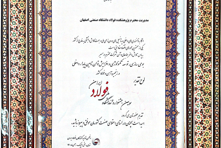 سومین جشنواره و نمایشگاه ملی فولاد ایران توسط انجمن تولید کنندگان فولاد ایران ، از تاریخ 19 تا 21 بهمن ماه در هتل المپیک تهران برگزار و پژوهشکده فولاد دانشگاه صنعتی اصفهان موفق به دريافت عنوان تأمین کننده برتر شرکت فولادمبارکه در حوزه تحقیق و توسعه و تکنولوژی شد.