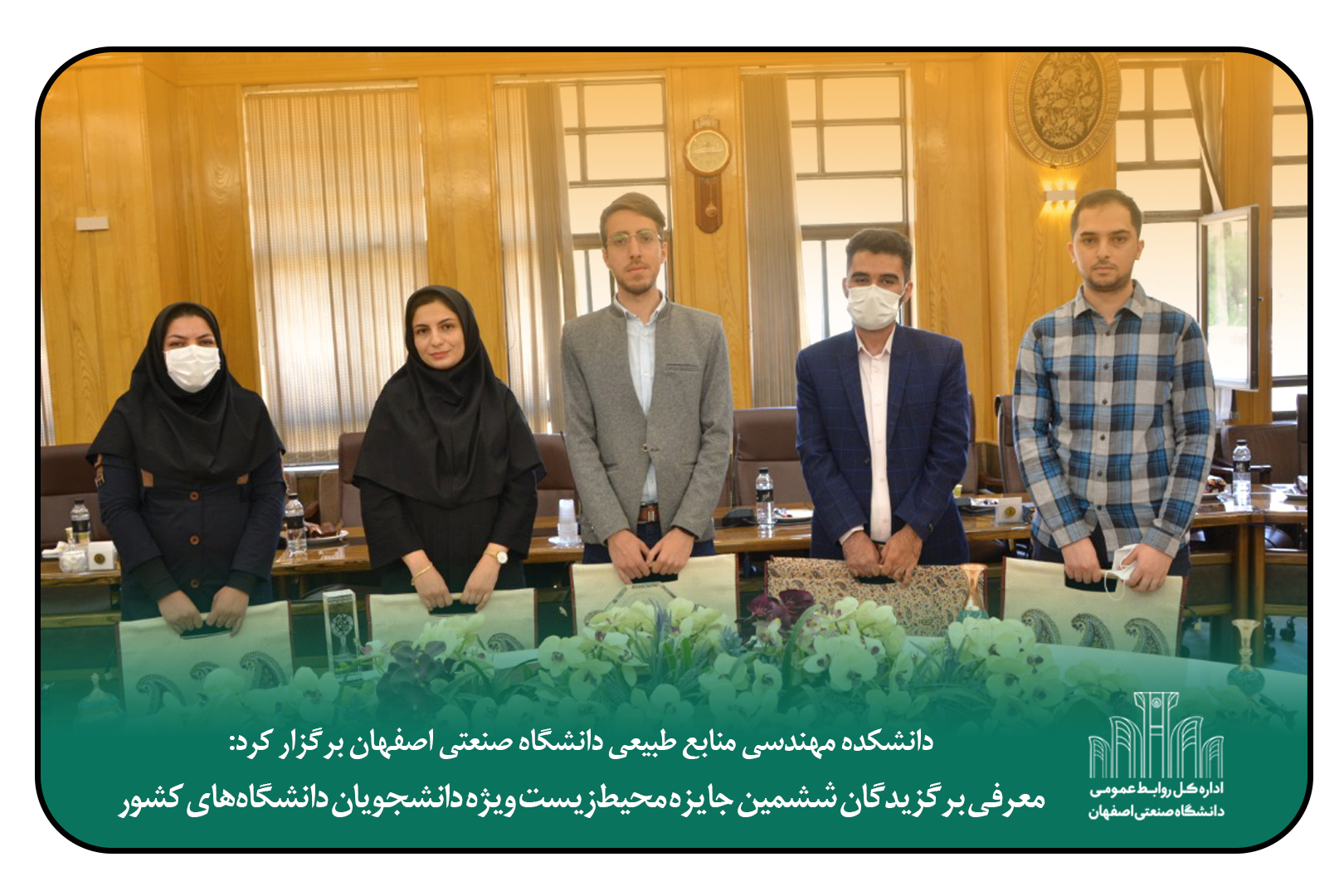 در آئین اختتامیه ششمین دوره جایزه محیط‌زیست ویژه دانشجویان دانشگاه‌های کشور که با حضور رئیس سازمان محیط‌زیست استان اصفهان و معاون پژوهش و فناوری دانشگاه صنعتی اصفهان، صبح امروز 19 اردیبهشت‌ماه به  میزبانی دانشکده مهندسی منابع طبیعی دانشگاه صنعتی اصفهان برگزار شد؛ از  10 عنوان دستاورد علمی دانشجویی در حوزه محیط‌زیست تقدیر شد.