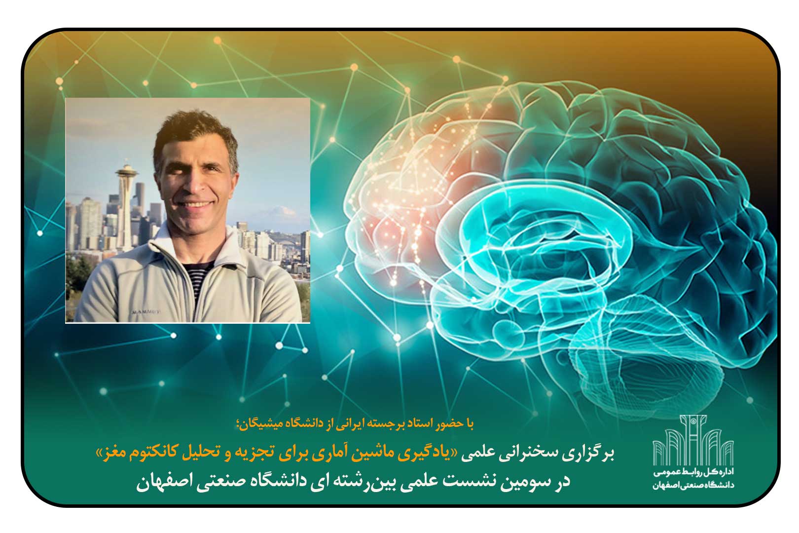 سومین سخنرانی از سلسله سخنرانی‌های بین‌رشته‌ای دانشگاه صنعتی اصفهان، به سخنرانی علمی با موضوع « یادگیری ماشین آماری برای تجزیه و تحلیل کانکتوم مغز» با ارایه دکتر علی شجاعی استاد ایرانی دانشگاه واشنگتن و عضو برگزیده انجمن آماری آمریکا(ASA) ، اختصاص داده شده است.