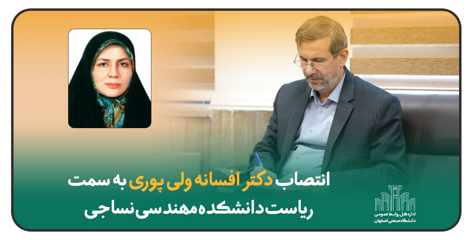 دکتر میبدی، رئیس دانشگاه صنعتي اصفهان، خانم دکتر افسانه ولی پور استادیار دانشکده مهندسی نساجی را براي مدت سه سال به سمت رياست این دانشکده منصوب كرد.