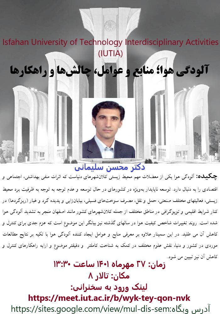 پنجمين سخنرانی از سلسله سخنرانی‌های بین‌رشته‌ای دانشگاه صنعتی اصفهان با موضوع بررسی «آلودگي هوا، منابع و عوامل، چالش ها و راهكارها» با ارايه دكتر محسن سليماني عضو هئيت علمي دانشكده مهندسي منابع طبيعي دانشگاه صنعتي اصفهان روز 27 مهرماه در تالار 8 دانشگاه صنعتي اصفهان و همچنين به صورت برخط برگزار می‌شود.