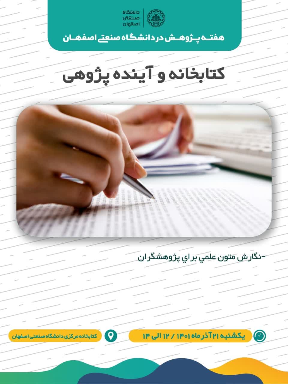 برگزاری نمایشگاهچهارشنبه 23 آذرماه سالن کنفرانس دانشگاه صنعتی اصفهان کتابخانه و آینده پژوهی استراتژي جستجو در پايگاههاي اطلاعاتي با تاكيد بر scopus و web of Science و نحوه دسترسي به متن كامل مقالات شنبه 12 آذر 1401