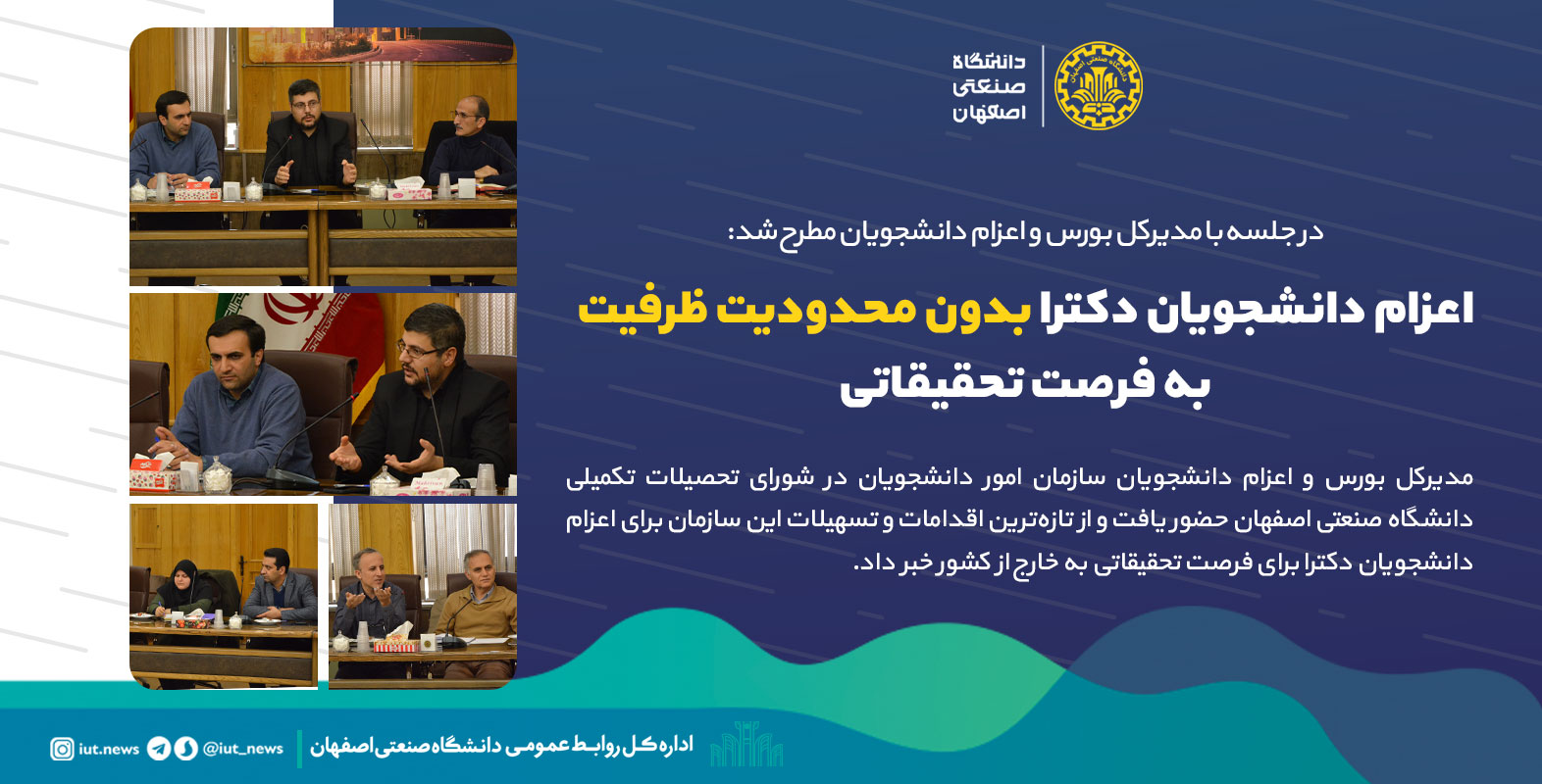 مدیرکل بورس و اعزام دانشجویان سازمان امور دانشجویان در شورای تحصیلات تکمیلی دانشگاه صنعتی اصفهان حضور یافت و از تازه‌ترین اقدامات و تسهیلات این سازمان برای اعزام دانشجویان دکترا برای فرصت تحقیقاتی به خارج از کشور خبر داد.