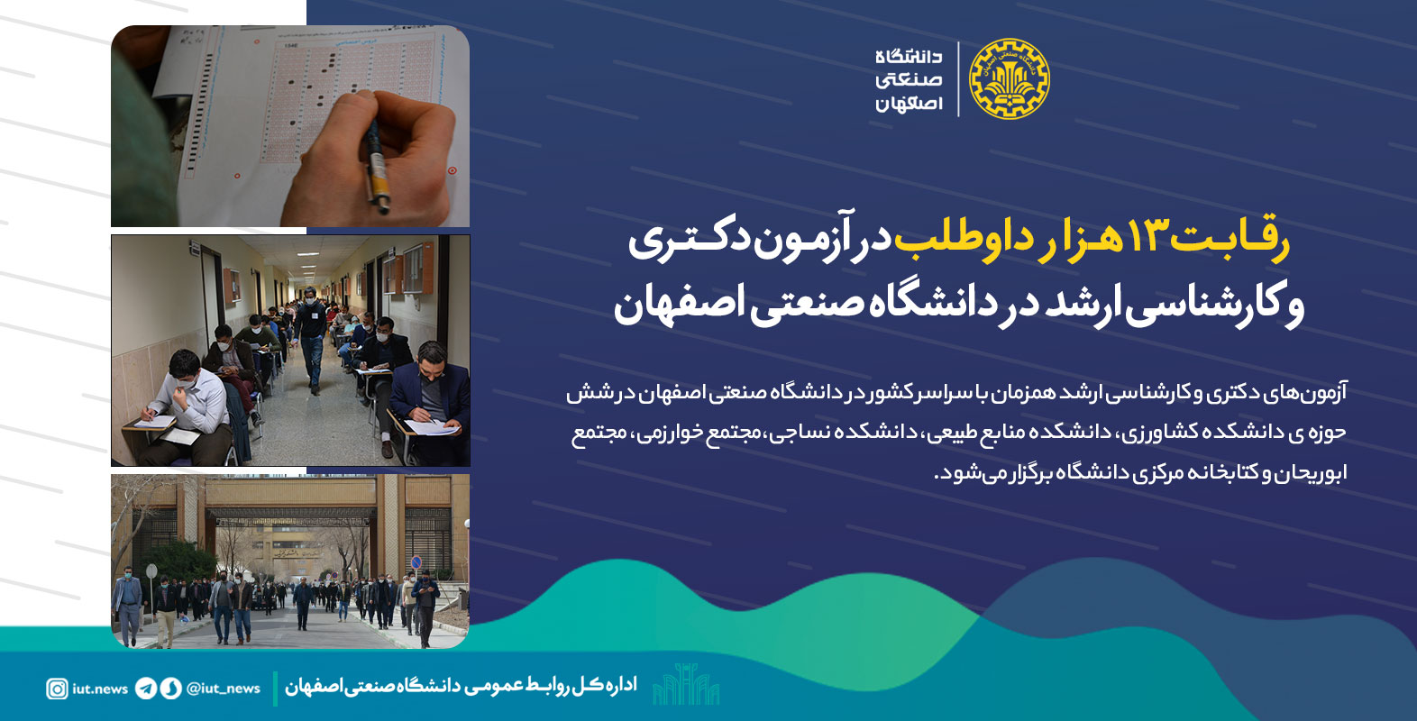 به گزارش روابط عمومی دانشگاه صنعتی اصفهان : آزمون دکتری با حضور 3 هزار و567 نفر داوطلب صبح روز پنج شنبه 11 اسفند ماه برگزار می شود.
