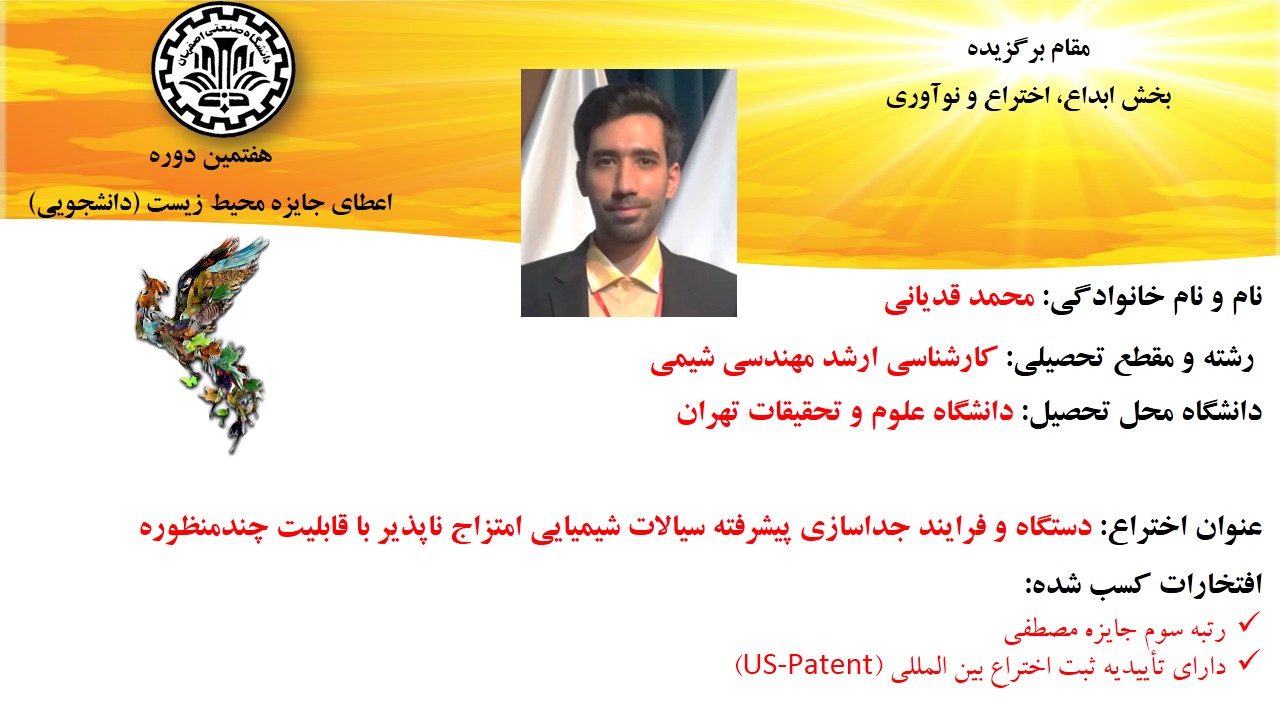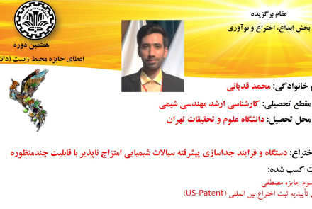 مقام برگزیده در بخش ابداع، اختراع و نوآوری به محمد قدیانی دانشجوی کارشناسی ارشد مهندسی شیمی از دانشگاه علوم و تحقیقات تهران اعطا شد. که موفق به اختراع دستگاه و فرایند جداسازی پیشرفته سیالات شیمیایی امتزاج ناپذیر با قابلیت چندمنظوره شده است. این طرح پیش از هم توانسته است رتبه سوم جایزه مصطفی را بدست آورد و دارای تأییدیه ثبت اختراع بین المللی (US-Patent) است.