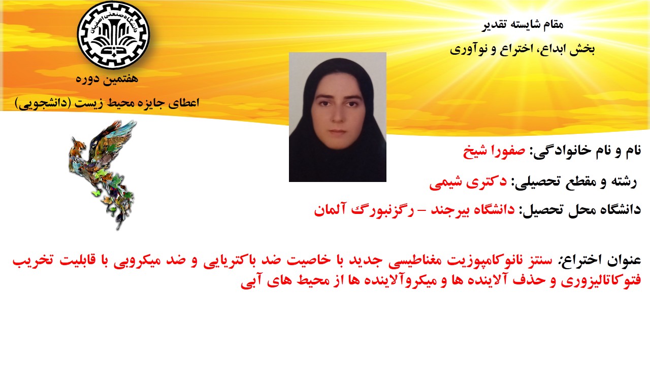 از جمله طرح های برگزیده معرفی شده در این دوره می توان به طرح برگزیده امید پوره ئی، دانشجوی دکترای شیمی، دانشگاه بوعلی سینا همدان اشاره کرد که موفق به کسب عنوان مقام برگزیده در بخش رساله برتر شد. این طرح با عنوان تصفیه پساب پالایشگاه با فرایندهای همگن فنتون و پرسولفات فعال شده با نور فرابنفش و نور خورشید، موفق به کسب افتخاراتی همچون ثبت اختراع ملی با تاییدیه بنیاد ملی نخبگان، طرح پژوهشی مورد حمایت شرکت نفت و انتشار مقالات متعدد در مجلات معتبر ملی و بینالمللی، شده است.