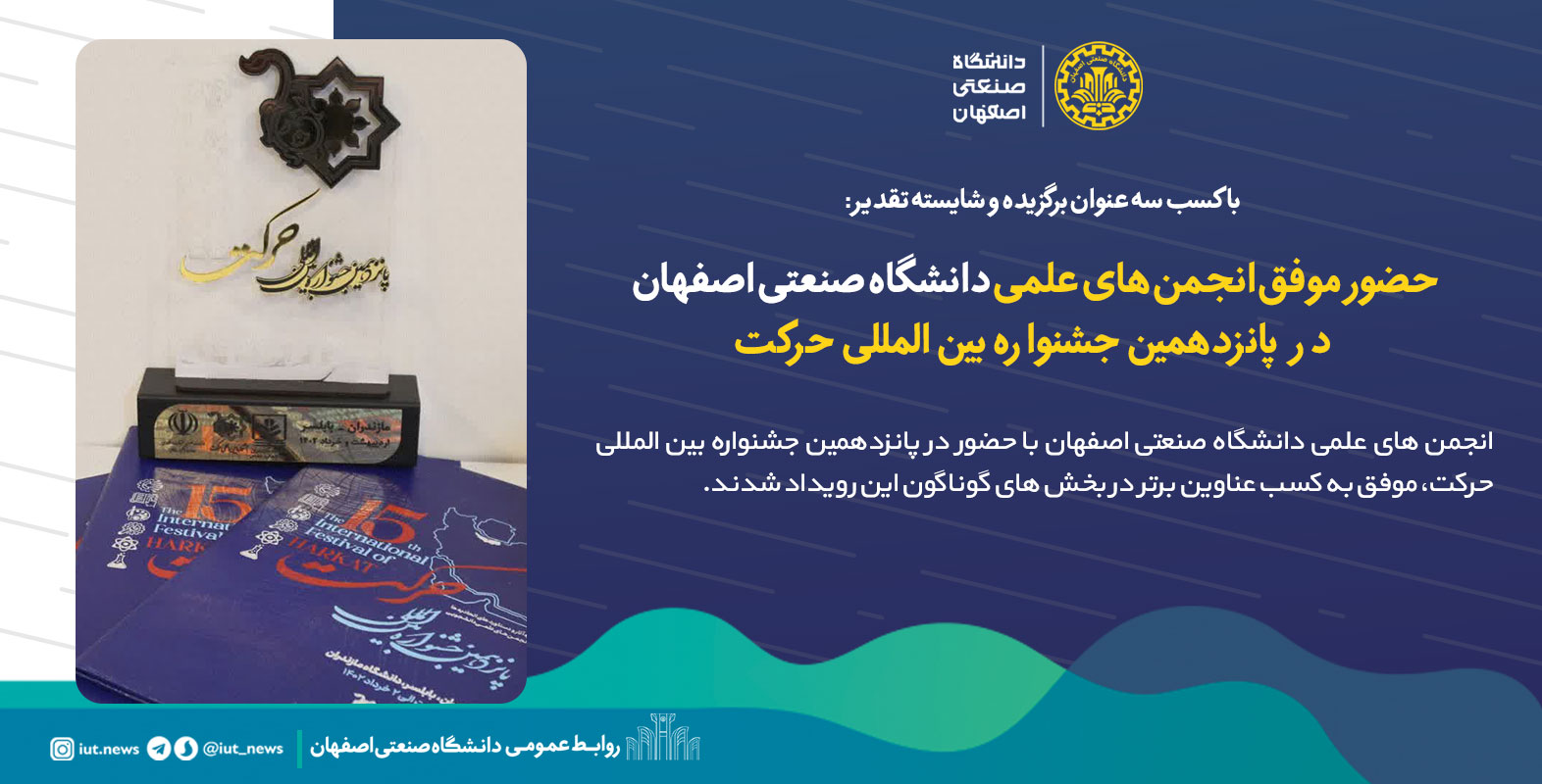 انجمن های علمی دانشگاه صنعتی اصفهان با حضور در پانزدهمین جشنواره بین المللی حرکت، موفق به کسب عناوین برتر در بخش های گوناگون این رویداد شدند.