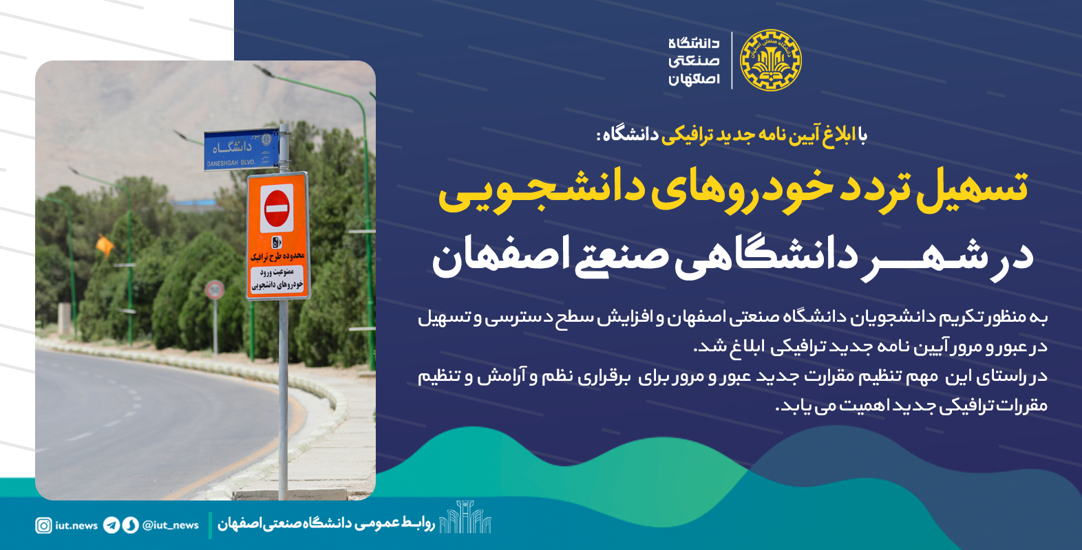اکنون دانشگاه صنعتی اصفهان به منظور تکریم دانشجویان تصمیم گرفته است این سطح دسترسی و تسهیل در عبور و مرور را افزایش دهد. به تبع آن تنظیم مقرارت جدید عبور و مرور برای  برقراری نظم و آرامش و تنظیم مقررات ترافیکی جدید اهمیت می یابد. مرکز کنترل ترافیک دانشگاه صنعتی اصفهان بر اساس فضاهای اختصاص یافته پارکینگ و نیازهای مراجعین، طرح جدید ترافیکی دانشگاه را به تصویب هئیت رئیسه رسانده و این طرح از تیرماه سال جاری لازم الاجرا است.