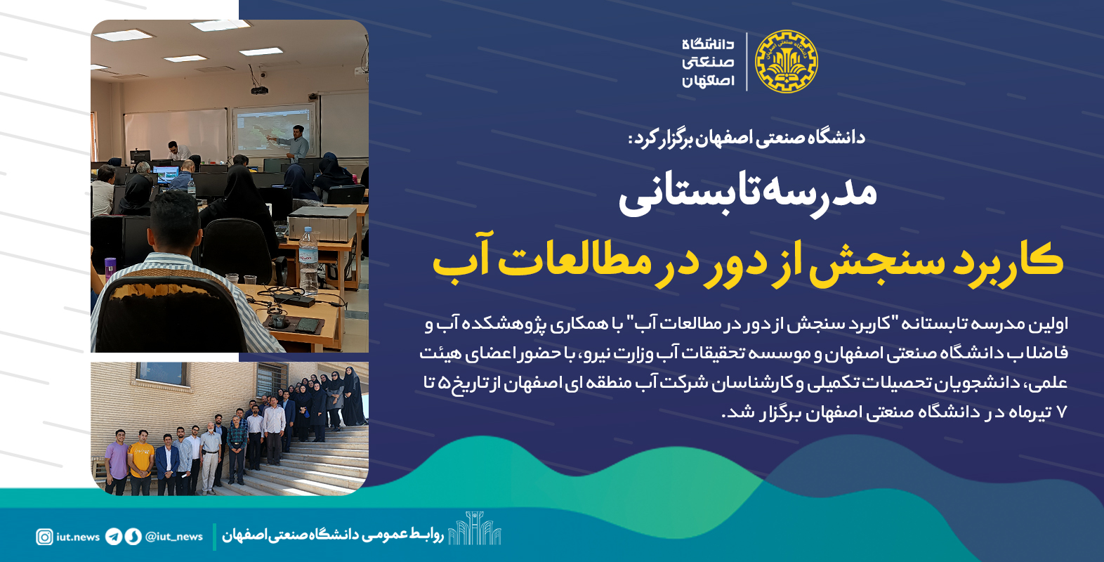 اولین مدرسه تابستانی 'کاربرد سنجش از دور در مطالعات آب' با همکاری پژوهشکده آب و فاضلاب دانشگاه صنعتی اصفهان و موسسه تحقیقات آب وزارت نیرو، با حضور اعضای هیئت علمی، دانشجویان تحصیلات تکمیلی و کارشناسان شرکت آب منطقه ای اصفهان از تاریخ 5 تا 7 تیرماه در دانشگاه صنعتی اصفهان برگزار شد.