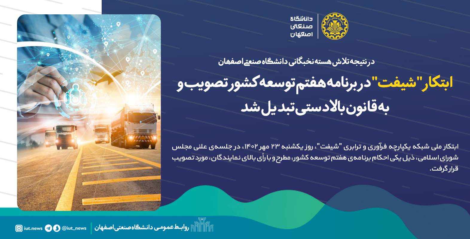 گفتنی است 'طراحی شبکه‌ی یکپارچه‌ی فرآوری و ترابری (شیفت)' در هسته نخبگانی با محوریت دانشگاه صنعتی اصفهان و در قالب طرح شهید دکتر بهشتی بنیاد ملی نخبگان، در خرداد ماه ۱۴۰۲ تصویب شده است و هم‌اکنون در حال انجام است.