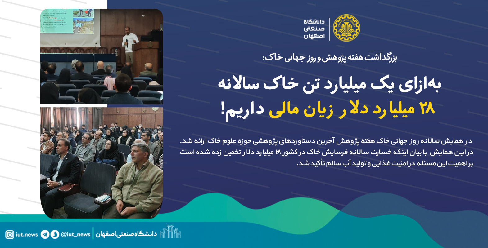 در همایش سالانه روز جهانی خاک در هفته پژوهش، آخرین دستاوردهای حوزه علوم خاک ارائه شد. در این همایش  با بیان اینکه خسارت سالانه فرسایش خاک در کشور 28 میلیارد دلار تخمین زده شده است بر اهمیت این مسئله  در امنیت غذایی و تولید آب سالم تأکید شد.