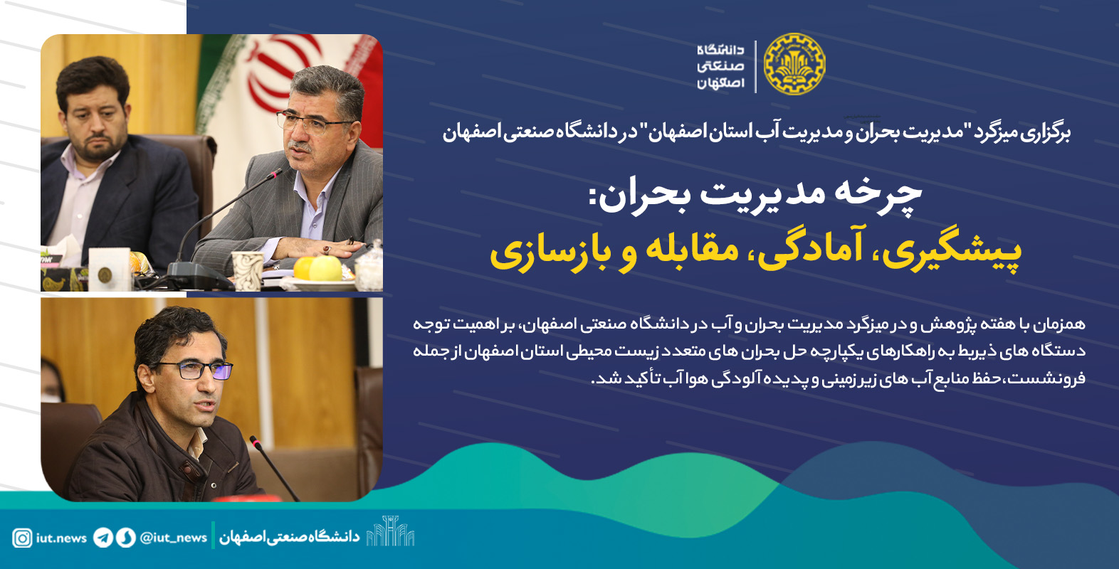 هم‌زمان با هفته پژوهش و در میزگرد مدیریت بحران و آب در دانشگاه صنعتی اصفهان، بر اهمیت توجه دستگاه‌های ذی‌ربط به راهکارهای یکپارچه حل بحران‌های متعدد زیست‌محیطی استان اصفهان از جمله فرونشست، حفظ منابع آب‌های زیر زمینی و پدیده آلودگی هوا آب تأکید شد.