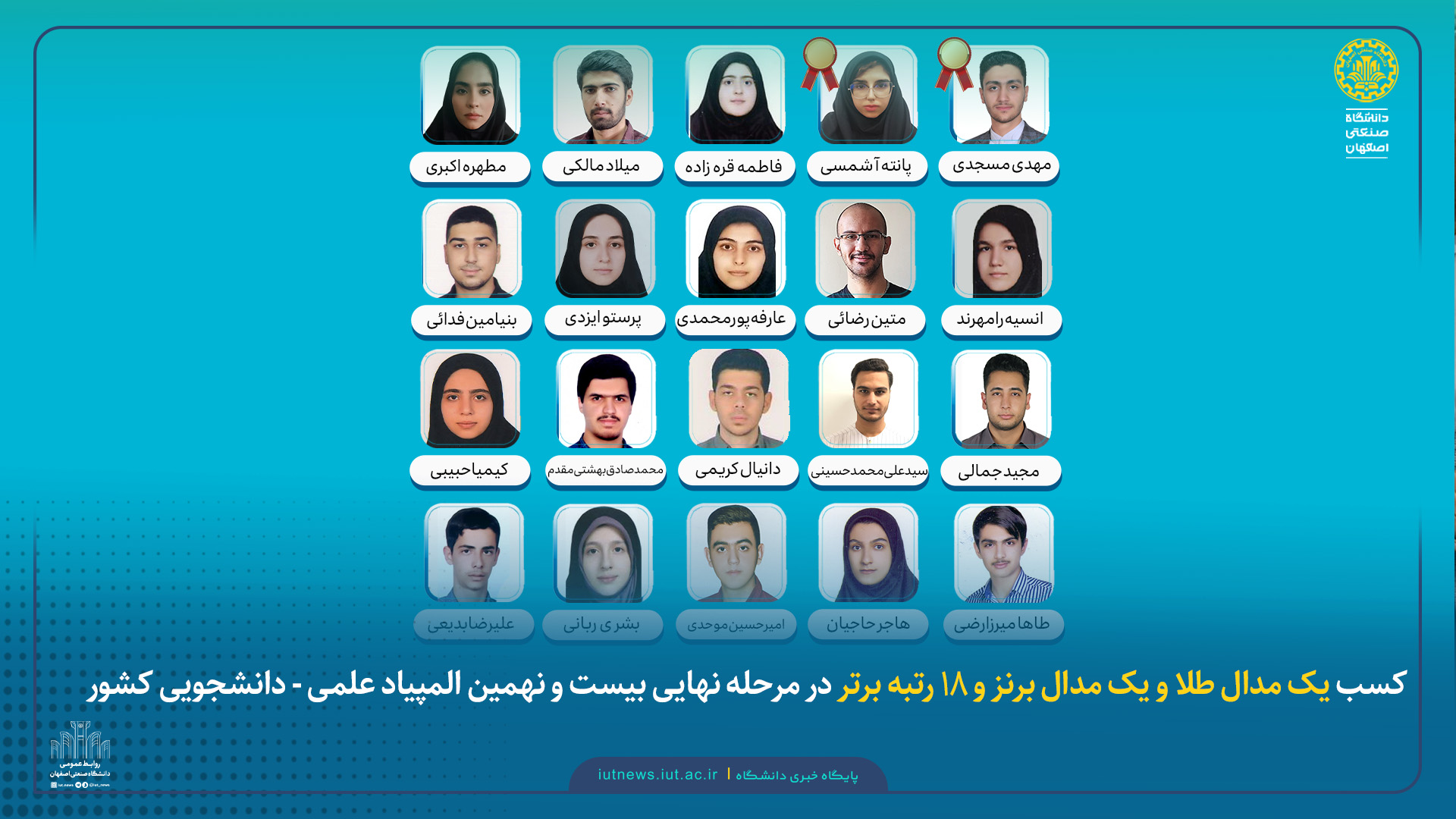 ه گزارش روابط‌عمومی دانشگاه صنعتی اصفهان، مهدی مسجدی اصفهانی دانشجوی رشته مهندسی صنایع رتبه اول و مدال طلا این رشته را به دست آورد. در رشته مهندسی کشاورزی زراعت و اصلاح نباتات نیز پانته آ شمسی رتبه سوم و صاحب مدال برنز شد.