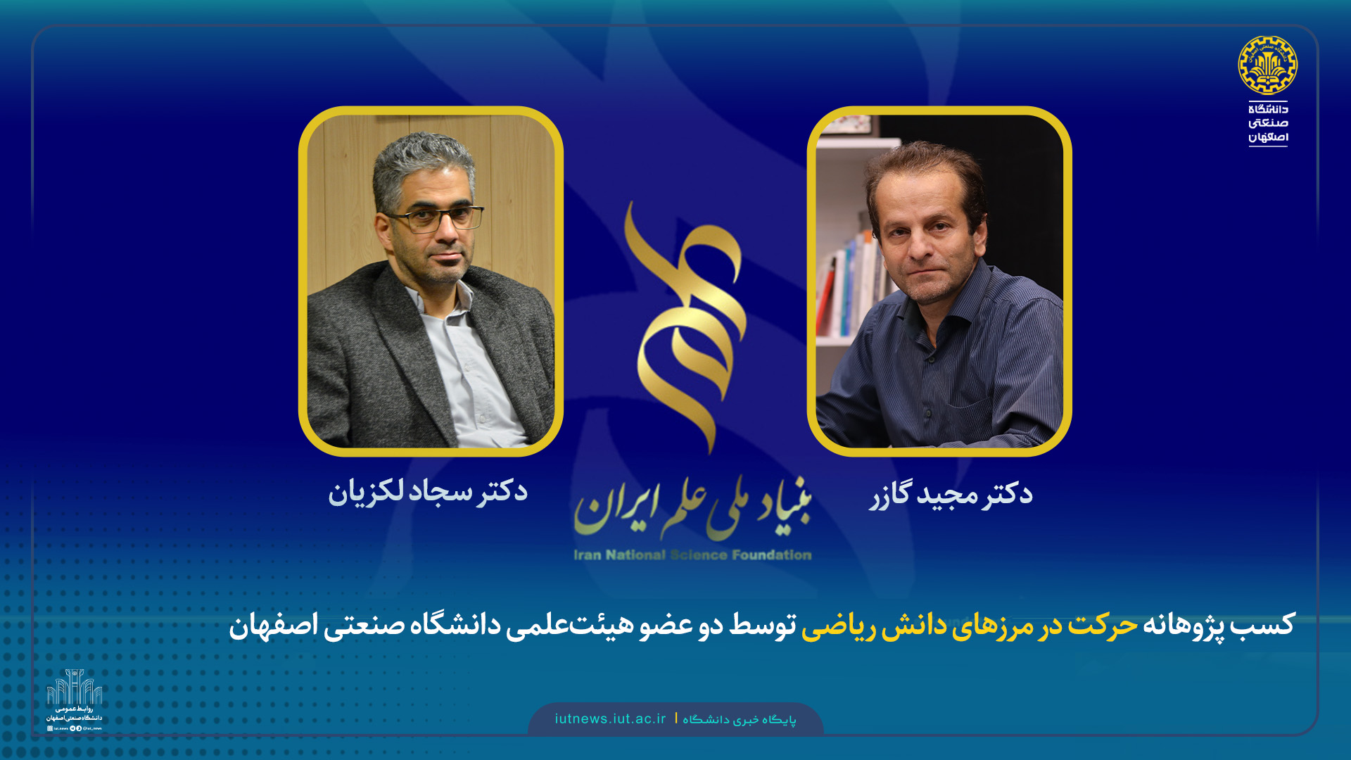 دکتر مجید گازر و دکتر سجاد لکزیان اعضای هیئتعلمی دانشکده ریاضی دانشگاه صنعتی اصفهان، موفق به کسب پژوهانه حرکت در مرزهای دانش ریاضی از بنیاد ملی علم ایران با حمایت معاونت ریاستجمهوری هر کدام به اعتبار ۱.۵ میلیارد تومان شدند.
