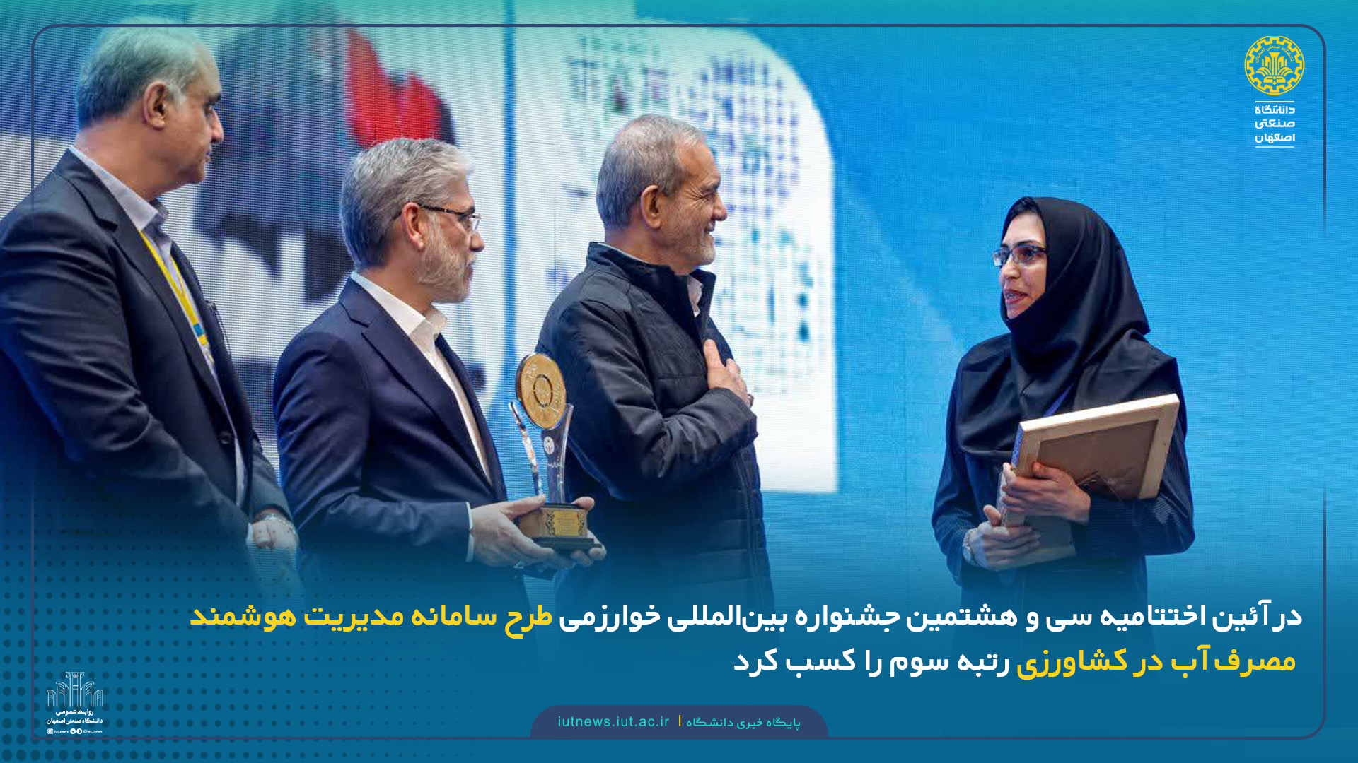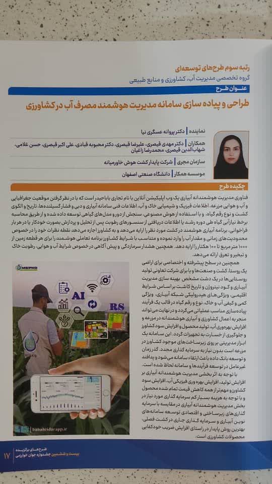 این شرکت با مدیریت دکتر مهدی قیصری، عضو هیئتعلمی دانشگاه صنعتی اصفهان، موفق شد با مشارکت ۲۵ درصدی، رتبه سوم بخش طرحهای توسعهای را در این جشنواره کسب کند. دکتر پروانه عسگری نیا، پژوهشگر و مدیرعامل این شرکت، لوح تندیس و جایزه جشنواره بینالمللی خوارزمی را از دستان دکتر مسعود پزشکیان، رئیسجمهور، دریافت کرد.گفتنی است «این سامانه با هدف بهینهسازی مصرف آب در بخش کشاورزی و استفاده از فناوریهای نوین طراحی شده است و میتواند نقش مؤثری در مدیریت پایدار منابع آبی کشور ایفا کند.» جشنواره بینالمللی خوارزمی به عنوان یکی از معتبرترین رویدادهای علمی کشور، هر ساله با هدف شناسایی و تقدیر از پژوهشگران، مخترعان و فناوران برتر در حوزههای مختلف علمی برگزار میشود.